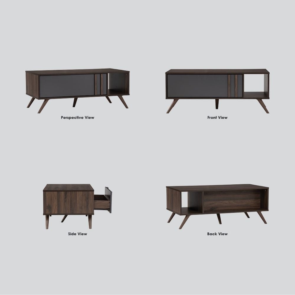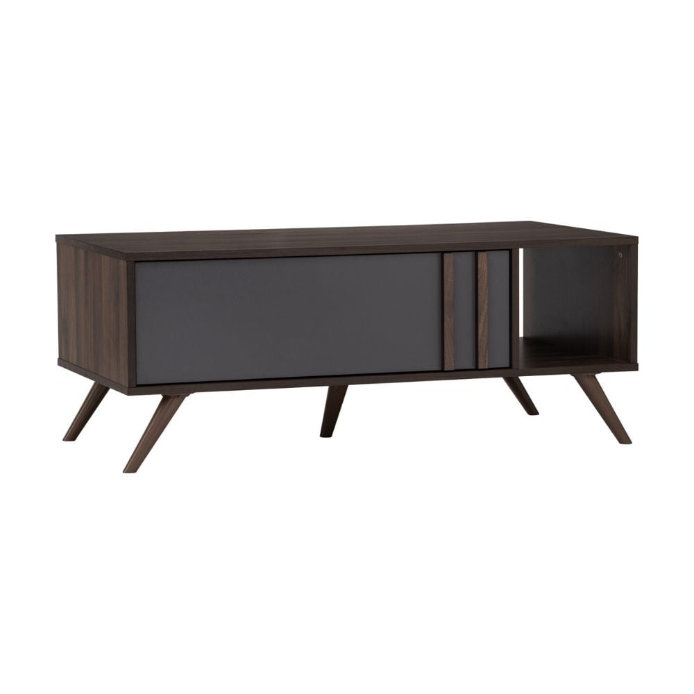 The Bragg Blackburn Coffee Table delivers a bold Mid-Century Modern look with a contemporary edge. Finished in a rich Columbia wood tone and contrasted with a dark grey drawer front, this coffee table adds depth and character to modern living spaces.