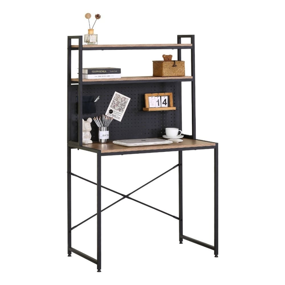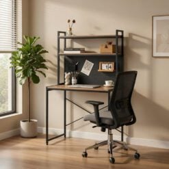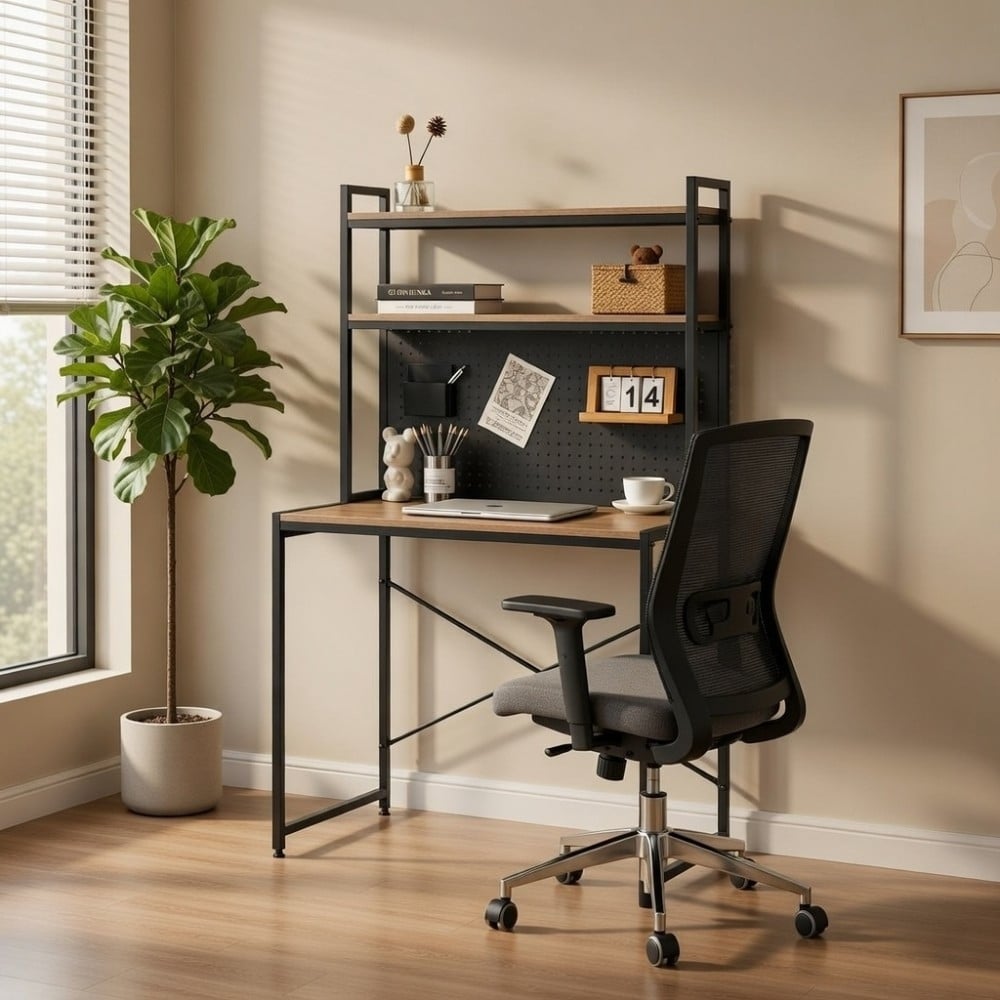 The spacious desktop provides a comfortable area for laptops, writing, or study tasks, while the integrated upper shelving adds convenient storage for books, décor, and office essentials. The built-in pegboard organiser panel allows you to keep frequently used items within easy reach, helping maintain a tidy and efficient workspace.