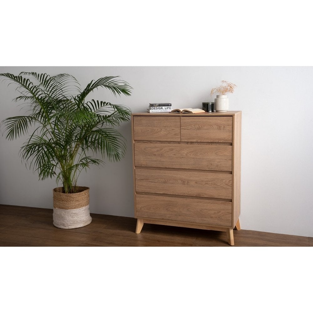 The Bragg Hirado Chest of Drawers brings Scandinavian simplicity and natural warmth into a refined, space-efficient storage piece. Designed with clean lines and balanced proportions, it features solid Malaysian oak legs paired with an oak-effect laminated body for a look that feels light, modern, and timeless.