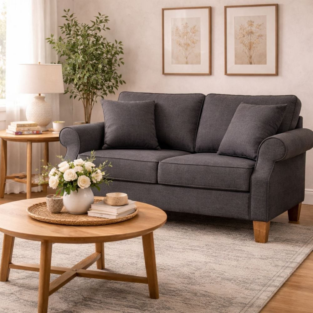 The Bragg Impala 2-Seater Sofa Couch with Scatter Cushions combines classic comfort with modern styling, making it a versatile choice for contemporary homes. Its elegant rolled arms, plush cushioning, and warm oak detailing create a refined look while maintaining a soft, inviting feel.