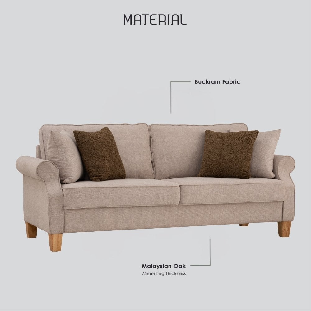 Upholstered in textured beige Buckram fabric, this sofa introduces a warm, neutral tone that blends easily with a wide range of décor styles. The sturdy Malaysian oak legs provide durability and natural character, while the generously sized seating area and plush back cushions ensure excellent comfort for everyday use.