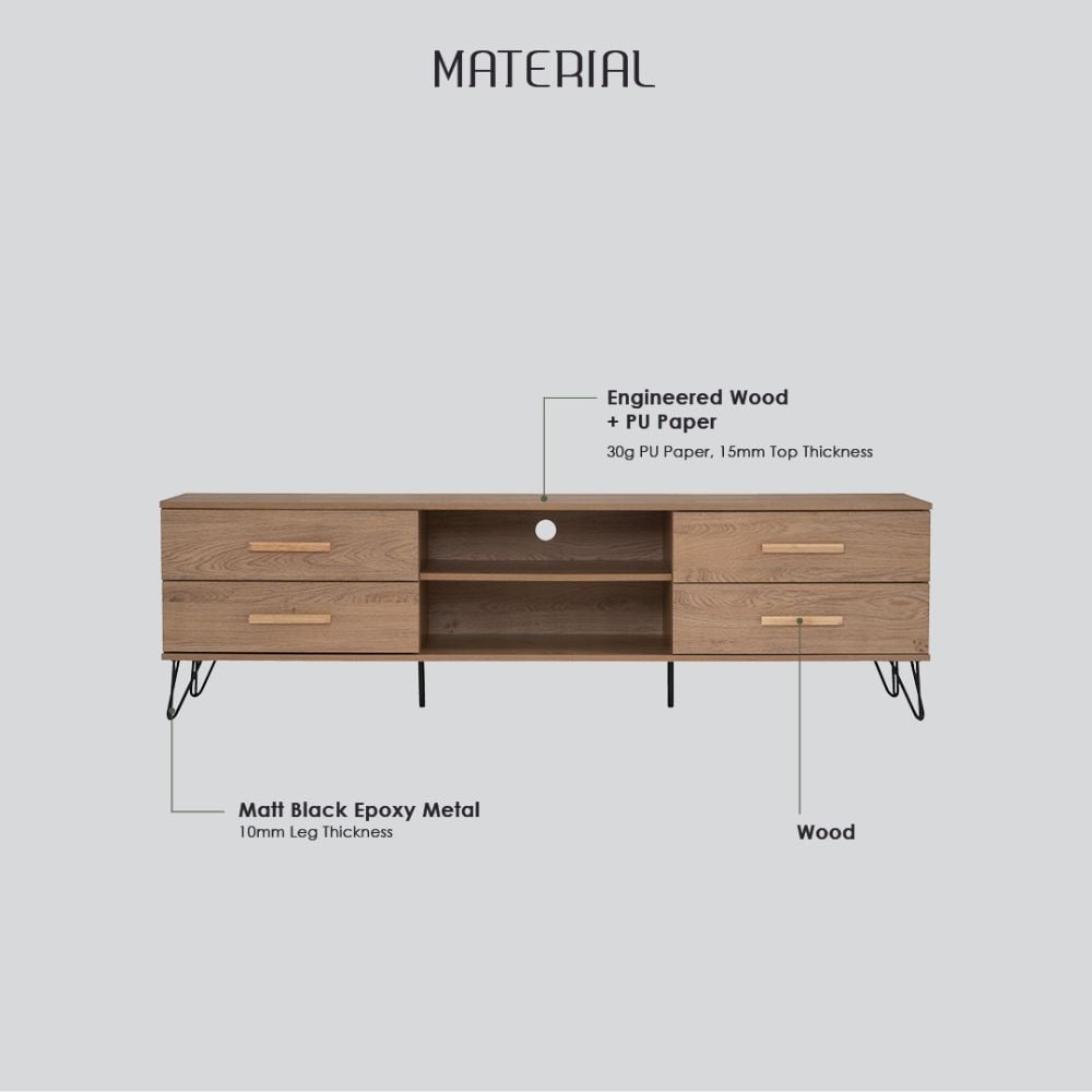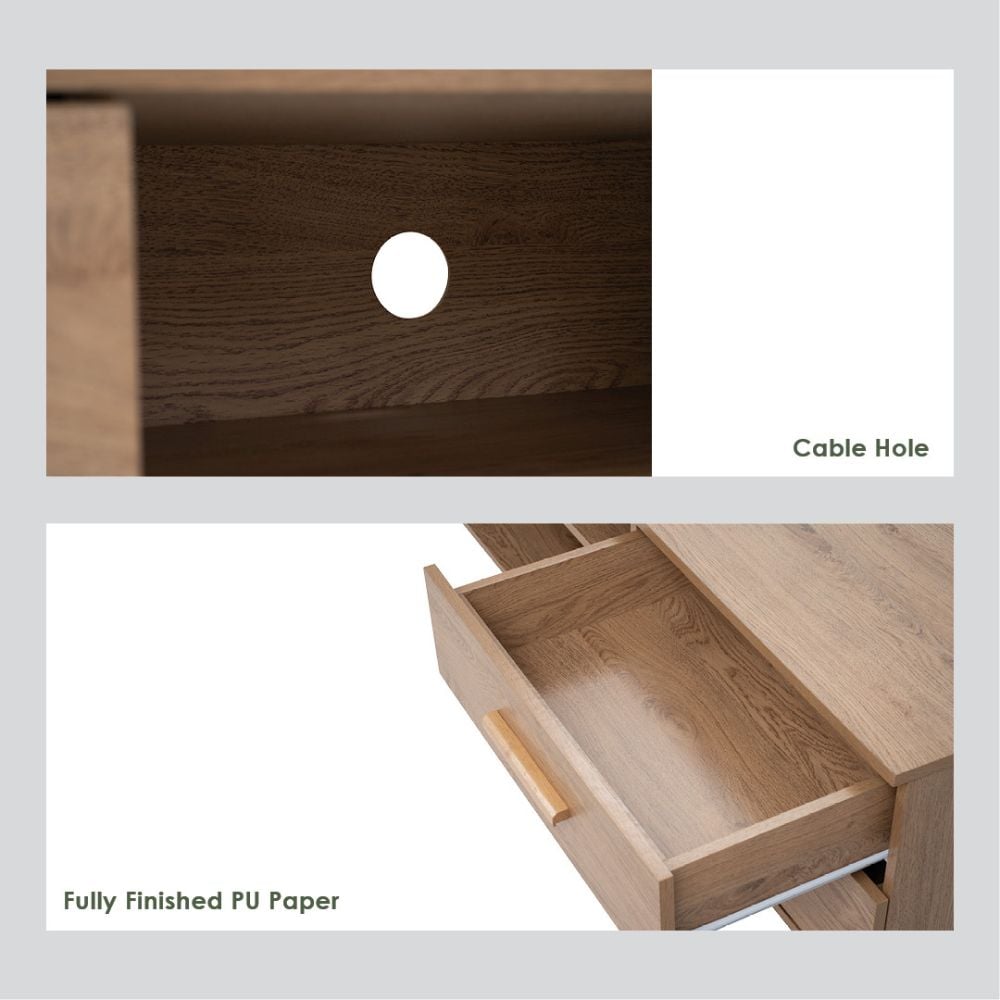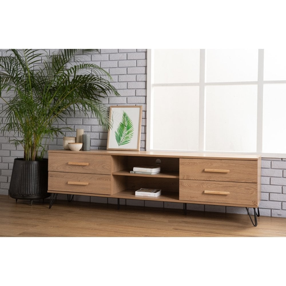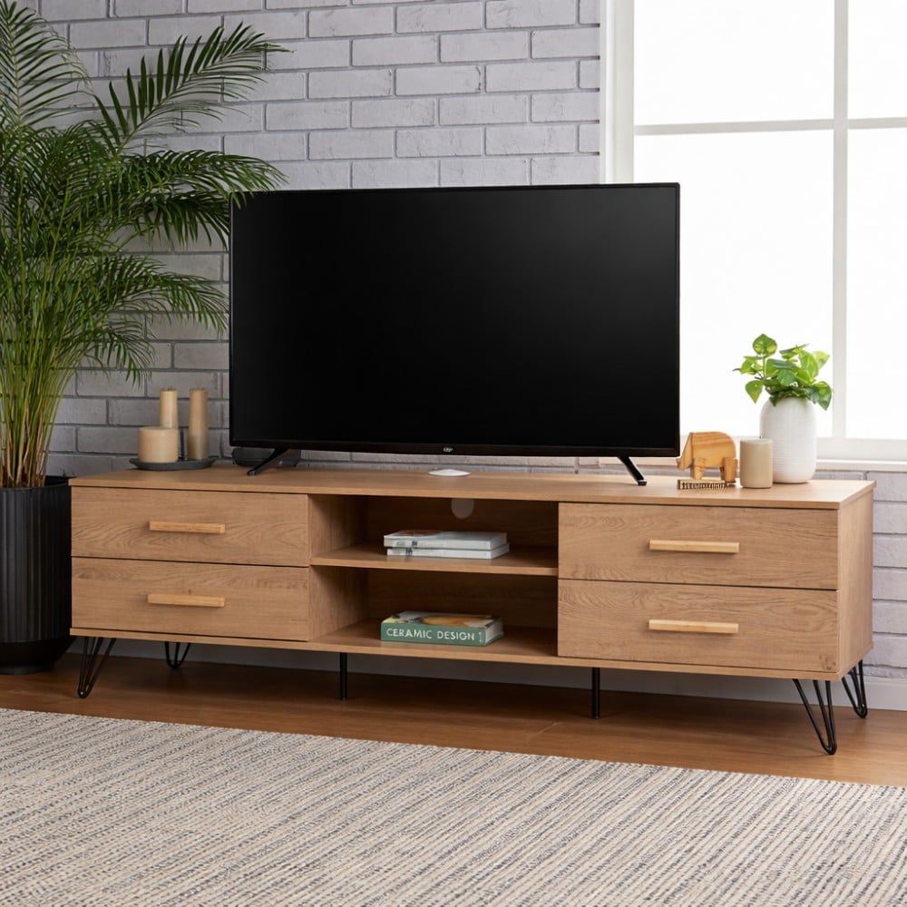 Crafted from a durable engineered wood with a realistic oak-effect finish, this TV Stand is designed to handle everyday use while maintaining a refined look. Four spacious drawers provide concealed storage for media accessories, while the central open shelves offer easy access for electronics. A discreet cable management opening keeps cords organised and out of sight.