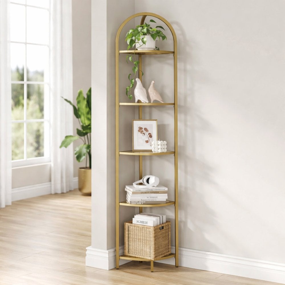 The Bragg Tromso 5-Tier Corner Display Shelf in opulent gold is a sophisticated addition to elevate your living space. With its sleek design, tempered glass shelves and golden-tone frame, this modern corner shelf brings a touch of luxury to any room. Showcase your interests and express your style with this contemporary corner rack!