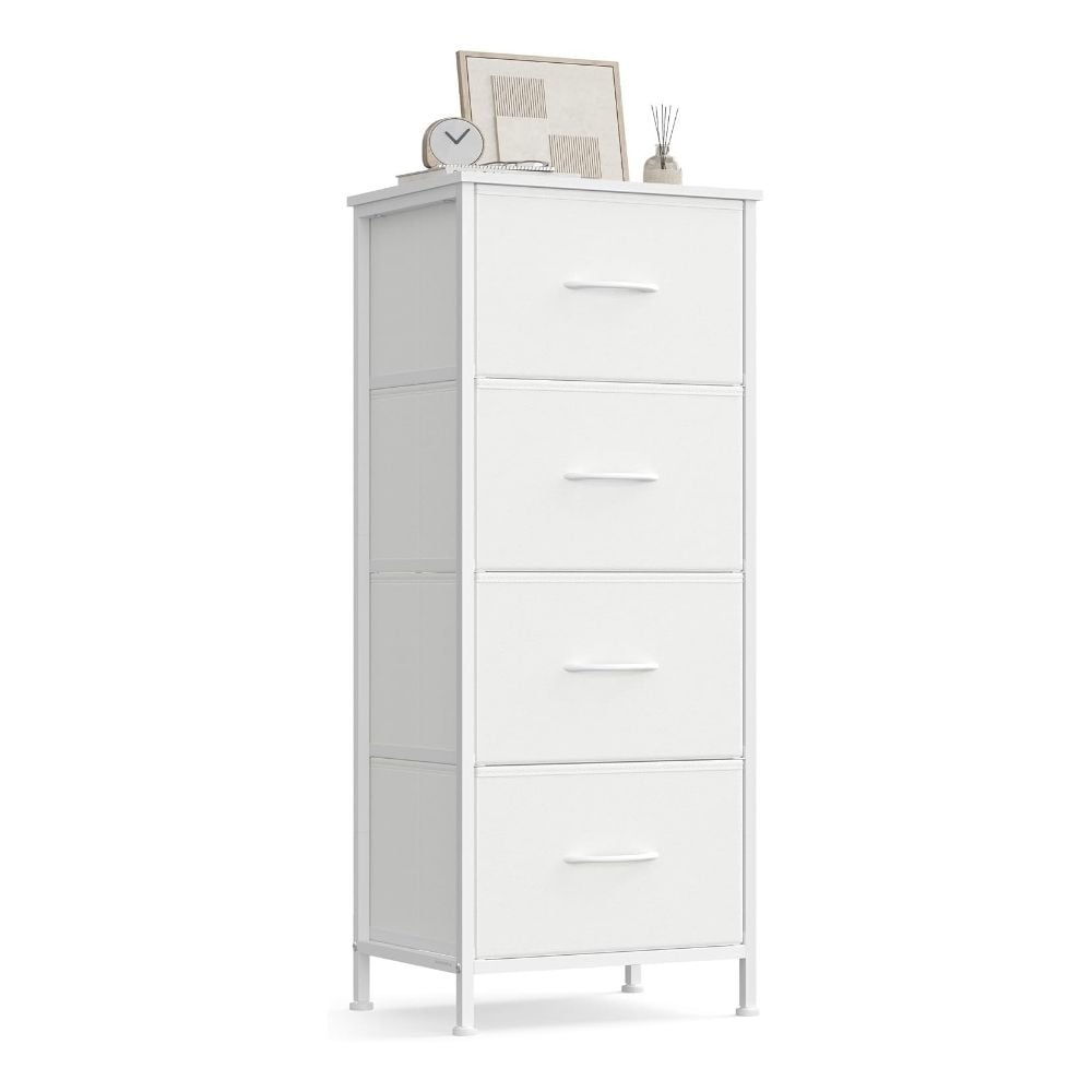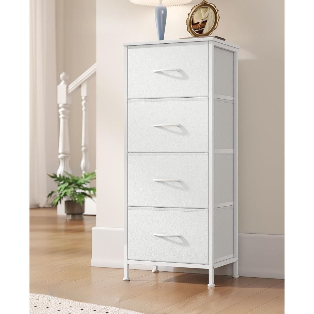 Designed for everyday use, it offers four spacious fabric drawers for concealed storage, while the durable MDF top provides a stable surface for décor, lamps, or daily essentials.