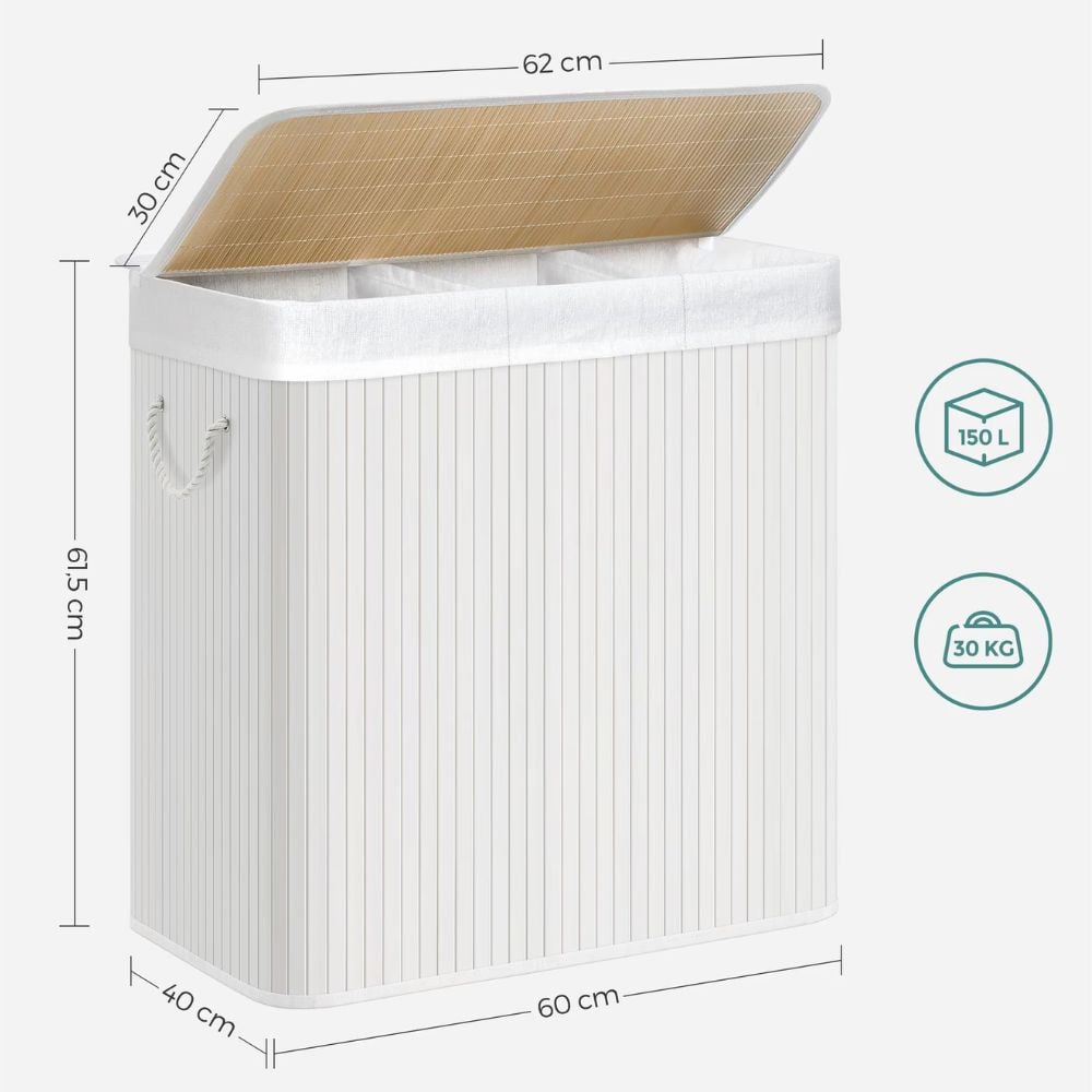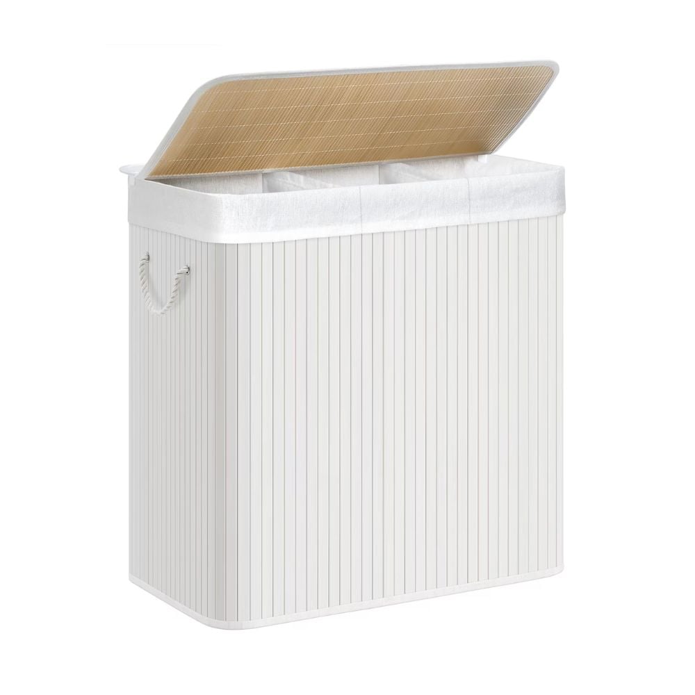Organise your laundry in style with the Songmics Woven Storage Laundry Basket with Lid. Beautifully handwoven from durable synthetic rattan in a crisp white finish, this laundry basket combines elegance with practicality, providing the perfect place to store dirty clothes while complementing any décor.